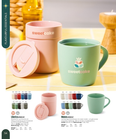 Matara AP800547Hochwertige Keramiktasse mit matter Au%u00dfen- und gl%u00e4nzender Innenseite. F%u00fcllmenge: 300ml. Einzeln in Kraftpapierbox.Gr%u00f6%u00dfe:%u00f890%u00d785mm Bedruckung:C1(8), P3(2)Menge1+250+500+1 000+Preis3,49 %u20ac3,37 %u20ac3,25 %u20ac3,14 %u20acLiberica AP800549Reisebecher aus Keramik mit Silikonummantelung mit Trinkdeckel aus PP Kunststoff. F%u00fcllmenge: 300ml. Gr%u00f6%u00dfe:%u00f880%u00d7108mmBedruckung:E3, ER1, C3(8)Menge1+100+250+500+Preis6,02 %u20ac5,81 %u20ac5,61 %u20ac5,41 %u20ac-01-06V-00-00-07V-04V-07-05-10-06V-77-06-80-06A-04V-06A-07-05-07V-10-8054FLAVOURFUL ESSENTIALS