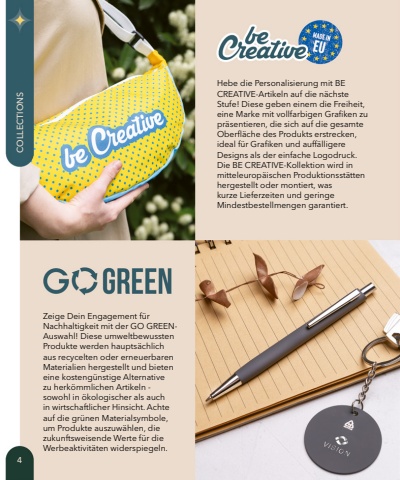 Hebe die Personalisierung mit BE CREATIVE-Artikeln auf die n%u00e4chste Stufe! Diese geben einem die Freiheit, eine Marke mit vollfarbigen Grafiken zu pr%u00e4sentieren, die sich auf die gesamte Oberfl%u00e4che des Produkts erstrecken, ideal f%u00fcr Grafiken und auff%u00e4lligere Designs als der einfache Logodruck. Die BE CREATIVE-Kollektion wird in mitteleurop%u00e4ischen Produktionsst%u00e4tten hergestellt oder montiert, was kurze Lieferzeiten und geringe Mindestbestellmengen garantiert.Zeige Dein Engagement f%u00fcr Nachhaltigkeit mit der GO GREENAuswahl! Diese umweltbewussten Produkte werden haupts%u00e4chlich aus recycelten oder erneuerbaren Materialien hergestellt und bieten eine kosteng%u00fcnstige Alternative zu herk%u00f6mmlichen Artikeln - sowohl in %u00f6kologischer als auch in wirtschaftlicher Hinsicht. Achte auf die gr%u00fcnen Materialsymbole, um Produkte auszuw%u00e4hlen, die zukunftsweisende Werte f%u00fcr die Werbeaktivit%u00e4ten widerspiegeln.4COLLECTIONS