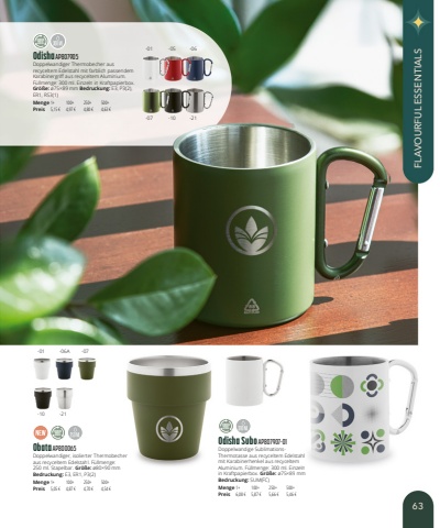 Odisha AP807905Doppelwandiger Thermobecher aus recyceltem Edelstahl mit farblich passendem Karabinergriff aus recyceltem Aluminium. F%u00fcllmenge: 300ml. Einzeln in Kraftpapierbox.Gr%u00f6%u00dfe:%u00f875%u00d789mm Bedruckung:E3, P3(2), ER1, RS3(1)Menge1+100+250+500+Preis5,15 %u20ac4,97 %u20ac4,80 %u20ac4,63 %u20acObata AP800065Doppelwandiger, isolierter Thermobecher aus recyceltem Edelstahl. F%u00fcllmenge: 250ml. Stapelbar. Gr%u00f6%u00dfe:%u00f880%u00d790mmBedruckung:E3, ER1, P3(2)Menge1+100+250+500+Preis5,05 %u20ac4,87 %u20ac4,70 %u20ac4,54 %u20acOdisha Subo AP807907-01Doppelwandige SublimationsThermotasse aus recyceltem Edelstahl mit Karabinerhenkel aus recyceltem Aluminium. F%u00fcllmenge: 300ml. Einzeln in Kraftpapierbox. Gr%u00f6%u00dfe:%u00f875%u00d789mmBedruckung:SUM(FC)Menge1+100+250+500+Preis6,08 %u20ac5,87 %u20ac5,66 %u20ac5,46 %u20ac-07-01-10-05-21-06-10-01-21-06A-07STAINLESSSTEELSTAINLESSSTEELSTAINLESSSTEEL63FLAVOURFUL ESSENTIALS