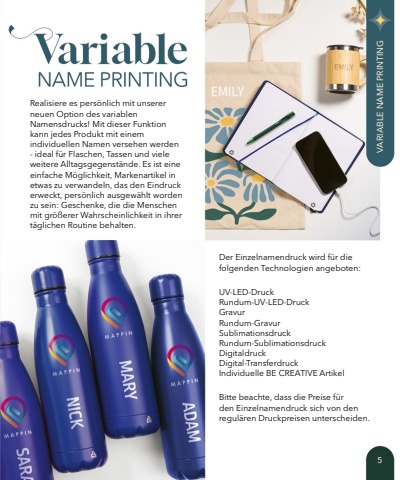 Realisiere es pers%u00f6nlich mit unserer neuen Option des variablen Namensdrucks! Mit dieser Funktion kann jedes Produkt mit einem individuellen Namen versehen werden - ideal f%u00fcr Flaschen, Tassen und viele weitere Alltagsgegenst%u00e4nde. Es ist eine einfache M%u00f6glichkeit, Markenartikel in etwas zu verwandeln, das den Eindruck erweckt, pers%u00f6nlich ausgew%u00e4hlt worden zu sein: Geschenke, die die Menschen mit gr%u00f6%u00dferer Wahrscheinlichkeit in ihrer t%u00e4glichen Routine behalten.Der Einzelnamendruck wird f%u00fcr die folgenden Technologien angeboten:UV-LED-DruckRundum-UV-LED-DruckGravurRundum-GravurSublimationsdruckRundum-SublimationsdruckDigitaldruckDigital-TransferdruckIndividuelle BE CREATIVE ArtikelBitte beachte, dass die Preise f%u00fcr den Einzelnamendruck sich von den regul%u00e4ren Druckpreisen unterscheiden.5VARIABLE NAME PRINTING