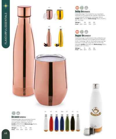 Rebby Oro AP800076Doppelwandiger Thermobecher aus recyceltem Edelstahl mit hochgl%u00e4nzender Metallic-Oberfl%u00e4che und Kunststoff-Trinkdeckel. F%u00fcllmenge: 350ml.Gr%u00f6%u00dfe:%u00f888%u00d7120mm Bedruckung:RS2(1), RUV(FC), ER1, E3, P3(2)Menge1+100+250+500+Preis8,54 %u20ac8,24 %u20ac7,95 %u20ac7,67 %u20acRoppar Oro AP800159Doppelwandige, kupferisolierte Vakuumflasche aus recyceltem Edelstahl mit hochgl%u00e4nzendem MetallicFinish. F%u00fcllmenge: 500ml. Die Kupferisolierung h%u00e4lt Getr%u00e4nke 12 Stunden lang hei%u00df und 24 Stunden lang kalt. Gr%u00f6%u00dfe:%u00f870%u00d7260mm Bedruckung:RS2(1), RUV(FC), ER1, E3, P3(1)Menge1+75+150+300+Preis9,96 %u20ac9,61 %u20ac9,27 %u20ac8,95 %u20acRecouver AP800764Doppelwandige vakuumisolierte Flasche aus recyceltem Edelstahl mit Boden aus Naturkork. F%u00fcllmenge: 500ml.Gr%u00f6%u00dfe:%u00f870%u00d7270mm Bedruckung:RS2(1), RUV(FC), ER1, E3, P3(2)Menge1+75+150+300+Preis9,70 %u20ac9,36 %u20ac9,03 %u20ac8,71 %u20ac-01-05-06-06A-07-10-21-97-97-98-98STAINLESSSTEELSTAINLESSSTEELSTAINLESSSTEEL68FLAVOURFUL ESSENTIALS