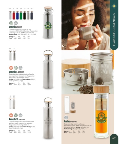 Renaslu AP808118Doppelwandige Vakuumflasche aus recyceltem Edelstahl mit Bambus-Tragedeckel. F%u00fcllmenge: 500ml. Gr%u00f6%u00dfe:%u00f870%u00d7220mmBedruckung:RS2(1), RUV(FC), ER1, E3, P3(2)Menge1+100+250+500+Preis8,80 %u20ac8,49 %u20ac8,19 %u20ac7,90 %u20acRenaslu XL AP808309Doppelwandige, vakuumisolierte Flasche aus recyceltem Edelstahl mit BambusTragedeckel. F%u00fcllmenge: 1000ml.Gr%u00f6%u00dfe:%u00f880%u00d7320mm Bedruckung:RS2(1), RUV(FC), ER1, E3, P3(2)Menge1+75+150+300+Preis12,81 %u20ac12,36 %u20ac11,93 %u20ac11,51 %u20acRenaslu L AP808308Doppelwandige, vakuumisolierte Flasche aus recyceltem Edelstahl mit Tragedeckel aus Bambus. F%u00fcllmenge: 750ml.Gr%u00f6%u00dfe:%u00f875%u00d7260mm Bedruckung:RS2(1), RUV(FC), ER1, E3, P3(2)Menge1+75+150+300+Preis11,13 %u20ac10,74 %u20ac10,36 %u20ac10,00 %u20acAndina AP800442Doppelwandige Isolierflasche aus Borosilikatglas mit Tee-Ei und Bambusdeckel. F%u00fcllmenge: 420ml. Gr%u00f6%u00dfe:%u00f872%u00d7235mmBedruckung:RS3(1), C2(8), P3(1), E3Menge1+75+150+300+Preis10,35 %u20ac9,99 %u20ac9,64 %u20ac9,30 %u20ac-01-05-06-07-10-21-01-01-21-21-80STAINLESSSTEELSTAINLESSSTEELSTAINLESSSTEEL69FLAVOURFUL ESSENTIALS