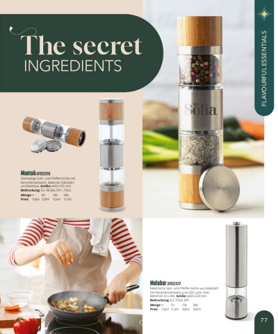 Muntok AP810398Zweiseitige Salz- und Pfefferm%u00fchle mit Keramikmahlwerk. Material: Edelstahl und Bambus. Gr%u00f6%u00dfe:%u00f845%u00d7195mmBedruckung:E2, RE2(6), ER1, P2(2)Menge1+50+100+200+Preis13,46 %u20ac12,99 %u20ac12,54 %u20ac12,10 %u20acMalabar AP812429Elektrische Salz- und Pfefferm%u00fchle aus Edelstahl mit Keramikmahlwerk und LED-Licht. Exkl. Batterien (4 x AA). Gr%u00f6%u00dfe:%u00f850%u00d7220mmBedruckung:E2, P2(2), ER1Menge1+75+150+300+Preis11,65 %u20ac11,24 %u20ac10,85 %u20ac10,47 %u20ac77FLAVOURFUL ESSENTIALS