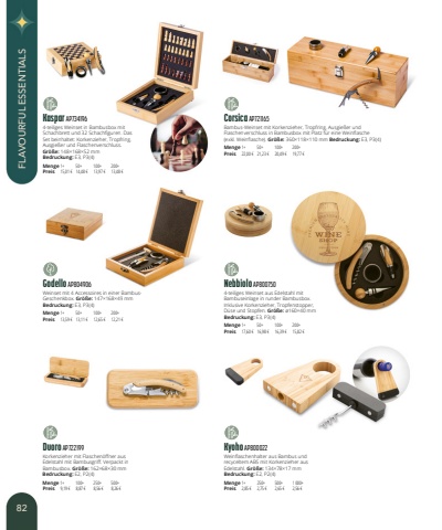 Kaspar AP7341964-teiliges Weinset in Bambusbox mit Schachbrett und 32 Schachfiguren. Das Set beinhaltet: Korkenzieher, Tropfring, Ausgie%u00dfer und Flaschenverschluss.Gr%u00f6%u00dfe:148%u00d7168%u00d752mmBedruckung:E3, P3(4)Menge1+50+100+200+Preis15,01 %u20ac14,48 %u20ac13,97 %u20ac13,48 %u20acGodello AP804906Weinset mit 4 Accessoires in einer BambusGeschenkbox. Gr%u00f6%u00dfe:147%u00d7168%u00d749mmBedruckung:E3, P3(4)Menge1+50+100+200+Preis13,59 %u20ac13,11 %u20ac12,65 %u20ac12,21 %u20acDuoro AP722199Korkenzieher mit Flaschen%u00f6ffner aus Edelstahl mit Bambusgriff. Verpackt in Bambusbox. Gr%u00f6%u00dfe:162%u00d768%u00d730mmBedruckung:E2, P2(4)Menge1+100+250+500+Preis9,19 %u20ac8,87 %u20ac8,56 %u20ac8,26 %u20acCorsica AP721165Bambus-Weinset mit Korkenzieher, Tropfring, Ausgie%u00dfer und Flaschenverschluss in Bambusbox mit Platz f%u00fcr eine Weinflasche (exkl. Weinflasche). Gr%u00f6%u00dfe:360%u00d7118%u00d7110mm Bedruckung:E3, P3(4)Menge1+50+100+200+Preis22,00 %u20ac21,23 %u20ac20,49 %u20ac19,77 %u20acNebbiolo AP8007504-teiliges Weinset aus Edelstahl mit Bambuseinlage in runder Bambusbox. Inklusive Korkenzieher, Tropfenstopper, D%u00fcse und Stopfen. Gr%u00f6%u00dfe:%u00f8160%u00d740mmBedruckung:E3, P3(4)Menge1+50+100+200+Preis17,60 %u20ac16,98 %u20ac16,39 %u20ac15,82 %u20acKyoho AP800022Weinflaschenhalter aus Bambus und recyceltem ABS mit Korkenzieher aus Edelstahl. Gr%u00f6%u00dfe:134%u00d778%u00d717mmBedruckung:E2, P2(4)Menge1+250+500+1 000+Preis2,85 %u20ac2,75 %u20ac2,65 %u20ac2,56 %u20ac82FLAVOURFUL ESSENTIALS