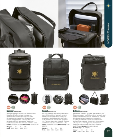 Messner AP800156-10Wasserdichter RPET-Rucksack mit Rei%u00dfverschlussHauptfach, 2 Rei%u00dfverschluss-Fronttaschen, Seitentaschen und Rei%u00dfverschluss-Schuhfach. Mit gepolstertem Laptopfach (15\R%u00fccken und gepolsterten Schultergurten. Mit l%u00e4ngenverstellbaren Seitengurten. Material: PUbeschichtetes 600D RPET-Polyester. Mit RPET-Label.Gr%u00f6%u00dfe:300%u00d7460%u00d7210mm Bedruckung:TC(8), DTC(FC)Menge1+25+50+100+Preis30,28 %u20ac29,22 %u20ac28,20 %u20ac27,21 %u20acBrunel AP800043-10RPET-Rucksack mit weichem PU-Lederbesatz oben, Rei%u00dfverschluss-Hauptfach, vorderer Rei%u00dfverschlusstasche, Seitentaschen und verstecktem Anti-Diebstahlfach. Mit TrolleyGurt, gepolstertem R%u00fccken und Laptopfach (15\im RPET-Vlies-Staubbeutel. Mit RPET-Label. Gr%u00f6%u00dfe:290%u00d7380%u00d7115mm Bedruckung:TC(8), DTC(FC)Menge1+25+50+100+Preis32,35 %u20ac31,22 %u20ac30,13 %u20ac29,08 %u20acPullman AP800130-10Wasserfester, zweifach nutzbarer RPET-Rucksack und Dokumententasche mit Rei%u00dfverschluss-Hauptfach, zwei vordere Rei%u00dfverschlusstaschen, Seitentasche, seitlicher Schnallenriemen und gepolstertem Laptopfach (15\Schultergurten. Inklusive zus%u00e4tzlichem abnehmbarem Schultergurt zur Nutzung als Dokumententasche. Material: PU-beschichtetes 600D RPET-Polyester. Mit RPET-Label. Gr%u00f6%u00dfe:290%u00d7430%u00d7160mmBedruckung:TC(8), DTC(FC)Menge1+25+50+100+Preis28,46 %u20ac27,46 %u20ac26,50 %u20ac25,57 %u20ac87MOMENTS AWAY