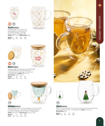 Snostro AP800151Doppelwandiger Thermobecher aus Borosilikatglas mit weihnachtlichem Schneeflockendesign. F%u00fcllmenge: 350ml. Einzeln in Kraftpapier-Box.Gr%u00f6%u00dfe:%u00f883%u00d7116mm Bedruckung:C2(8)Menge1+100+250+500+Preis6,34 %u20ac6,12 %u20ac5,91 %u20ac5,70 %u20acBostro AP800152Doppelwandiger Thermobecher aus Borosilikatglas mit weihnachtlichem Schneeflockendesign und Bambusdeckel. F%u00fcllmenge: 310ml. Einzeln in Kraftpapierbox. Gr%u00f6%u00dfe:%u00f883%u00d7131mmBedruckung:C2(8), E2, P2(4)Menge1+100+250+500+Preis6,60 %u20ac6,37 %u20ac6,15 %u20ac5,93 %u20acHonkapuu AP812437Doppelwandiger Becher aus Borosilikatglas mit Bambusdeckel, Schneeflockenmuster und umgedrehtem Weihnachtsbaum im Inneren. F%u00fcllmenge: 200ml. Einzeln in Kraftpapierbox.Gr%u00f6%u00dfe:%u00f894%u00d7109mm Bedruckung:C2(8), E2, P2(4)Menge1+75+150+300+Preis11,65 %u20ac11,24 %u20ac10,85 %u20ac10,47 %u20acSjonsta AP812438Becher aus Borosilikatglas mit dreidimensionaler Weihnachtsbaumdekoration. F%u00fcllmenge: 550ml. Einzeln in Kraftpapierbox. Gr%u00f6%u00dfe:%u00f892%u00d7120mmBedruckung:C2(8)Menge1+75+150+300+Preis9,83 %u20ac9,49 %u20ac9,16 %u20ac8,84 %u20ac310 ML7HOLIDAY HIGHLIGHTS