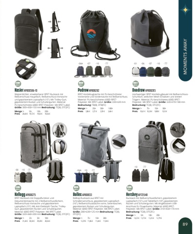 Kellogg AP808275RPET-Rucksack mit Doppelfunktion und Dokumententasche mit 2 Rei%u00dfverschlussf%u00e4chern, Rei%u00dfverschluss-Vortasche und gepolstertem Laptopfach (15\Gurt, gepolstertem R%u00fccken und Schultergurten. Material: 600D RPET-Polyester. Mit RPET-Label.Gr%u00f6%u00dfe:320%u00d7460%u00d7200mm Bedruckung:TC(8), DTC(FC)Menge1+25+50+100+Preis31,44 %u20ac30,34 %u20ac29,28 %u20ac28,26 %u20acKasier AP800586-10Wasserdichter, erweiterbarer RPET-Rucksack mit Rei%u00dfverschluss-Hauptfach, Rei%u00dfverschluss-Vortasche und gepolstertem Laptopfach (15\gepolstertem R%u00fccken und Schultergurten. Material: PU-beschichtetes 600D RPET-Polyester. Mit RPET-Label.Gr%u00f6%u00dfe:300%u00d7450%u00d7150mm Bedruckung:TC(8), DTC(FC)Menge1+50+100+200+Preis20,44 %u20ac19,72 %u20ac19,03 %u20ac18,36 %u20acRollex AP808133Rolltop-Rucksack aus RPET mit Schnallenverschluss, gepolstertem Laptopfach (16\gepolstertem R%u00fccken und Schultergurten. Material: 600D RPET-Polyester. Mit RPET-Label.Gr%u00f6%u00dfe:280%u00d7630%u00d7125mm Bedruckung:TC(8), DTC(FC)Menge1+75+150+300+Preis12,29 %u20ac11,86 %u20ac11,44 %u20ac11,04 %u20acPudrow AP808282RPET-Kordelzugtasche mit PU-beschichteter Vorderseite und Vordertasche mit Rei%u00dfverschluss. Material: PU-beschichtetes 600D RPETPolyester. Mit RPET-Label. Gr%u00f6%u00dfe:330%u00d7420mmBedruckung:TB(8), DTB(FC)Menge1+250+500+1 000+Preis3,86 %u20ac3,72 %u20ac3,59 %u20ac3,46 %u20acHershey AP721548Rucksack mit Rei%u00dfverschlussf%u00e4chern, gepolstertem Laptopfach (15\R%u00fccken und Schultergurten. Mit eingebautem USBAnschluss f%u00fcr Powerbanks. Material: 600D RPETPolyester. Mit RPET-Label. Gr%u00f6%u00dfe:310%u00d7450%u00d7170mmBedruckung:TC(8), DTC(FC)Menge1+50+100+200+Preis14,23 %u20ac13,73 %u20ac13,25 %u20ac12,79 %u20acDuodraw AP808285Hochwertiger RPET-Kordelzugbeutel mit Rei%u00dfverschlussSchuhfach, seitlichen Mesh-Eins%u00e4tzen und breiten Tr%u00e4gern. Material: PU-beschichtetes 600D RPETPolyester. Mit RPET-Label. Gr%u00f6%u00dfe:320%u00d7470%u00d7180mmBedruckung:TC(8), DTC(FC)Menge1+75+150+300+Preis10,61 %u20ac10,24 %u20ac9,88 %u20ac9,53 %u20ac-06A-06A-10-77-10-00-10-77-77-07-10-77-01-06-07-10-7789MOMENTS AWAY