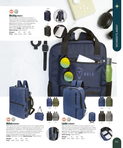 Walton AP800074RPET-Rucksack und Dokumententasche mit Doppelfunktion, mit Rei%u00dfverschlussfach, 2 Rei%u00dfverschluss-Fronttaschen und gepolstertem Laptopfach (15%und Schultergurten. Inklusive zus%u00e4tzlichem abnehmbaren Schultergurt zur Verwendung als Dokumententasche. Material: 600D RPET-Polyester. Mit RPET-Label.Gr%u00f6%u00dfe:280%u00d7400%u00d7130mm Bedruckung:TC(8), DTC(FC)Menge1+50+100+200+Preis16,82 %u20ac16,23 %u20ac15,66 %u20ac15,11 %u20acWesting AP800157RPET-Rucksack mit Rei%u00dfverschlussfach, 2 Rei%u00dfverschluss-Fronttaschen, gepolstertem Laptopfach (15\gepolstertem R%u00fccken und Schultergurten, Diebstahlschutztasche und TrolleyGurt. Material: RPET-Twill-Polyester. Mit RPET-Label. Gr%u00f6%u00dfe:300%u00d7390%u00d7110mmBedruckung:TC(8), DTC(FC)Menge1+50+100+200+Preis20,96 %u20ac20,23 %u20ac19,52 %u20ac18,84 %u20acLauder AP800075RPET-Rucksack mit Rei%u00dfverschluss-Hauptfach und 3 Rei%u00dfverschluss-Fronttaschen. Mit gepolstertem Tablet- (10\gepolsterten Schultergurten. Material: 600D RPETPolyester. Mit RPET-Label. Gr%u00f6%u00dfe:300%u00d7410%u00d7120mmBedruckung:TC(8), DTC(FC)Menge1+50+100+200+Preis17,47 %u20ac16,86 %u20ac16,27 %u20ac15,70 %u20ac-06A-06A-06A-10-10-07-07-77-77-1091MOMENTS AWAY