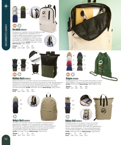 Recabak AP800128Rucksack aus recyceltem Canvas mit Rei%u00dfverschlussHauptfach, gepolstertem Laptopfach (15\vorderen Rei%u00dfverschlusstaschen, Seitentaschen, Trolley-Gurt sowie gepolsterten R%u00fccken- und Schultergurten. Hergestellt aus 70 % recycelter Baumwolle und 30 % RPET-Polyester. Mit Label recycelte Baumwolle. Gr%u00f6%u00dfe:320%u00d7440%u00d7170mmBedruckung:TC(8), DTC(FC)Menge1+50+100+200+Preis17,60 %u20ac16,98 %u20ac16,39 %u20ac15,82 %u20acBlakkan Back AP800132Rolltop-Rucksack aus recyceltem Canvas mit Schnallenverschluss und Rei%u00dfverschluss-Fronttasche aus weichem recyceltem PU-Leder. Mit gepolstertem Laptopfach (15 Zoll), Seitentaschen, gepolstertem R%u00fccken und Schultergurten. Material: 70 % recycelte Baumwolle und 30 % RPET-Polyester. Mit Labele recycelte Baumwolle. Gr%u00f6%u00dfe:260%u00d7560%u00d7140mm Bedruckung:TC(8), DTC(FC)Menge1+50+100+200+Preis13,97 %u20ac13,48 %u20ac13,01 %u20ac12,55 %u20acDropex AP800186Kordelzugbeutel aus 70 % recycelter Baumwolle und 30 % RPET-Polyester, 140g/m%u00b2. Mit Label recycelte Baumwolle.Gr%u00f6%u00dfe:370%u00d7410mm Bedruckung:TB(8), DTB(FC), S1(4)Menge1+250+500+1 000+Preis2,07 %u20ac2,00 %u20ac1,93 %u20ac1,86 %u20acRebyss Back AP808145Rucksack aus recycelten Canvas mit Hauptfach mit Rei%u00dfverschluss, gepolstertem Laptopfach (15\Seitentaschen, Trolley-Gurt, gepolstertem R%u00fccken und Schultergurten. Mit versteckter Diebstahlschutztasche. 70 % recycelter Baumwolle und 30 % RPET-Polyester. Mit Label recycelte Baumwolle.Gr%u00f6%u00dfe:320%u00d7460%u00d7140mm Bedruckung:TC(8), DTC(FC)Menge1+50+100+200+Preis16,82 %u20ac16,23 %u20ac15,66 %u20ac15,11 %u20acRebyss Roll AP808144Rolltop-Rucksack aus recycelten Canvas mit Schnalle und Klettverschluss, gepolstertem Laptopfach (15\Vorder- und Seitentaschen. Mit Trolley-Gurt, gepolstertem R%u00fccken und Schultergurten. 70 % recycelter Baumwolle und 30 % RPET-Polyester. Mit Label recycelte Baumwolle.Gr%u00f6%u00dfe:320%u00d7560%u00d7120mm Bedruckung:TC(8), DTC(FC)Menge1+50+100+200+Preis17,98 %u20ac17,35 %u20ac16,74 %u20ac16,15 %u20ac-06A-06A-05-06-01-06A-10-10-10-00-00-00-01-00-10-10-07-06-06-07-07-77-7792MOMENTS AWAY