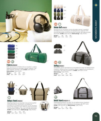 Franco AP800092RPET-Sporttasche mit Rei%u00dfverschluss-Hauptfach, vorderer Rei%u00dfverschlusstasche und langen Henkeln. Material: 190T RPET-Polyester. Mit RPET-Label. Gr%u00f6%u00dfe:%u00f8230%u00d7480mmBedruckung:TC(8), DTC(FC)Menge1+250+500+1 000+Preis3,62 %u20ac3,49 %u20ac3,37 %u20ac3,25 %u20acRebyss Travel AP808142Reise-/Sporttasche aus recycelten Canvas mit Hauptfach mit Rei%u00dfverschluss, Vordertasche, verstellbarem Schultergurt und Rei%u00dfverschlusstasche auf der R%u00fcckseite, die auch als Trolleygurt dient. 70 % recycelter Baumwolle und 30 % RPET-Polyester. Mit Label recycelte Baumwolle.Gr%u00f6%u00dfe:560%u00d7390%u00d7220mm Bedruckung:TC(8), DTC(FC)Menge1+75+150+300+Preis12,81 %u20ac12,36 %u20ac11,93 %u20ac11,51 %u20acRefelt Travel AP800574-77Zweifarbige Sporttasche aus RPET Filz mit Rei%u00dfverschluss-Hauptfach und -Fronttasche sowie verstellbarem Schultergurt. Mit RPET-Label.Gr%u00f6%u00dfe:500%u00d7240%u00d7220mm Bedruckung:TC(8), DTC(FC)Menge1+75+150+300+Preis12,03 %u20ac11,61 %u20ac11,20 %u20ac10,81 %u20acDuffup AP800123Wasserfeste, weiche Sporttasche aus recyceltem PU-Leder mit Rei%u00dfverschlussHauptfach, Rei%u00dfverschluss-Fronttasche, langem Tragegriff und verstellbarem Schultergurt. Mit Label recyceltes PU. Gr%u00f6%u00dfe:520%u00d7320%u00d7175mmBedruckung:TC(8), DTC(FC)Menge1+50+100+200+Preis20,70 %u20ac19,98 %u20ac19,28 %u20ac18,61 %u20acRekan Duff AP800131Sporttasche aus recyceltem Canvas mit langen Henkeln. Hauptfach mit Rei%u00dfverschluss, Innentasche mit Rei%u00dfverschluss. Material: 70 % recycelte Baumwolle und 30 % recyceltes Polyester. Mit Label recycelte Baumwolle. Gr%u00f6%u00dfe:%u00f8250%u00d7500mm Bedruckung:TC(8), DTC(FC)Menge1+100+250+500+Preis8,02 %u20ac7,74 %u20ac7,47 %u20ac7,21 %u20ac-06A-06A-10-10-10-06A-00-10-06-00-07-07-77-7793MOMENTS AWAY