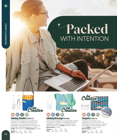 SuboBag Shoulder AP716917-10Individuelle Umh%u00e4ngetasche aus 600D RPETPolyester mit verstellbarem Schultergurt und Fronttasche mit Druckknopfverschluss. Mit vollfl%u00e4chigem Sublimationsdruck und markantem RPET-Etikett. Mindestbestellmenge: 25 St%u00fcck.Gr%u00f6%u00dfe:380%u00d7420%u00d720mm Bedruckung:FP-SU(FC)Menge25+50+100+200+Preis17,47 %u20ac16,86 %u20ac16,27 %u20ac15,70 %u20acSuboBag Messenger AP716946Individuelle Umh%u00e4ngetasche aus 600D RPET-Polyester mit langem Schultergurt und Knopfverschluss. Mit vollfl%u00e4chigem Sublimationsdruck. Mit RPET-Label. Mindestmenge: 25 Stk. Gr%u00f6%u00dfe:350%u00d7450%u00d7100mmBedruckung:FP-SU(FC)Menge25+50+100+200+Preis18,76 %u20ac18,10 %u20ac17,47 %u20ac16,86 %u20acCompack AP716915-10Individuelle Dokumenten- oder Laptoptasche aus RPET-Neopren mit vollfl%u00e4chigem Sublimationsdruck. Passend f%u00fcr Laptops bis 15 Zoll. Mindestmenge: 25 Stk. Gr%u00f6%u00dfe:307%u00d7231%u00d76mmBedruckung:FP-SU(FC)Menge25+75+150+300+Preis11,00 %u20ac10,62 %u20ac10,25 %u20ac9,89 %u20ac-01-1094MOMENTS AWAY