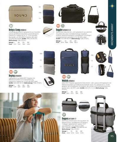 Doppex AP721899-77RPET-Dokumententasche mit Hauptfach mit Rei%u00dfverschluss, verstellbarem Schultergurt, Trolleygurt, gepolstertem Laptop- (15%und Tabletfach (10\RPET Polyester. Gr%u00f6%u00dfe:370%u00d7280%u00d750mmBedruckung:TC(8), DTC(FC)Menge1+50+100+200+Preis14,23 %u20ac13,73 %u20ac13,25 %u20ac12,79 %u20acWaldok AP800154600D RPET-Polyester-gepolsterte Dokumenten- oder Laptop-Umh%u00e4ngetasche mit Rei%u00dfverschlussfach und Rei%u00dfverschlusstasche vorne. F%u00fcr Laptops bis zu 15 Zoll geeignet. Mit verstellbarem Schultergurt, der vertikal und horizontal positioniert werden kann. Mit RPET-Label. Gr%u00f6%u00dfe:260%u00d7375%u00d715mm Bedruckung:TC(8), DTC(FC)Menge1+100+250+500+Preis8,41 %u20ac8,12 %u20ac7,84 %u20ac7,57 %u20acDuppler AP800125-10Wasserfeste Dokumenten- und Laptoptasche aus weichem recyceltem PU-Leder mit Rei%u00dfverschluss-Hauptfach, vorderer Rei%u00dfverschlusstasche, verstellbarem Schultergurt und gepolstertem Laptopfach (15\Gr%u00f6%u00dfe:410%u00d7300%u00d790mm Bedruckung:TC(8), DTC(FC)Menge1+50+100+200+Preis20,70 %u20ac19,98 %u20ac19,28 %u20ac18,61 %u20acRebyss Comp AP808143Vollst%u00e4ndig gepolsterte Laptoptasche aus recycelten Canvas mit Rei%u00dfverschlussfach und Vordertasche. Passend f%u00fcr Laptops bis zu 15\Baumwolle und 30 % RPET-Polyester. Mit Label recycelte Baumwolle. Gr%u00f6%u00dfe:400%u00d7270%u00d730mmBedruckung:TC(8), DTC(FC)Menge1+100+250+500+Preis7,51 %u20ac7,25 %u20ac7,00 %u20ac6,76 %u20acReptop AP800094Laptoptasche aus 600D RPET-Polyester mit Rei%u00dfverschlussfach und Innenpolsterung. Passend f%u00fcr Laptops bis 15 Zoll. Mit RPET-Label.Gr%u00f6%u00dfe:360%u00d7260%u00d740mm Bedruckung:TC(8), DTC(FC)Menge1+100+250+500+Preis5,18 %u20ac5,00 %u20ac4,83 %u20ac4,66 %u20ac-00-06A-06A-06A-10-10-10-77-7795MOMENTS AWAY