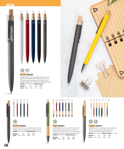 Boshly AP808090Kugelschreiber aus recyceltem Aluminium mit gummierter Oberfl%u00e4che, Bambusdr%u00fccker und Chromclip. Mit Spezialbeschichtung f%u00fcr eine Spiegellasergravur. Mit blauerschreibender Mine.Gr%u00f6%u00dfe: %u00f810%u00d7140 mm Bedruckung: E1Menge 1+ 750+ 1 500+ 3 000+Preis 1,09 %u20ac 1,05 %u20ac 1,01 %u20ac 0,97 %u20acBosher AP808074Kugelschreiber aus recyceltem Aluminium mit Bambusdr%u00fccker. Mit blauschreibender Mine.Gr%u00f6%u00dfe: %u00f810%u00d7140 mm Bedruckung: E0, P1(4)Menge 1+ 750+ 1 500+ 3 000+Preis 0,86 %u20ac 0,83 %u20ac 0,80 %u20ac 0,77 %u20acBogri AP808075Kugelschreiber aus recyceltem Aluminium mit Griffzone und Dr%u00fccker aus Bambus, Schaft mit soft-touch-finish und gun-colored Applikationen. Mit blauschreibender Mine.Gr%u00f6%u00dfe: %u00f89%u00d7138 mm Bedruckung: E0Menge 1+ 750+ 1 500+ 3 000+Preis 0,91 %u20ac 0,88 %u20ac 0,85 %u20ac 0,82 %u20acSeppoo AP809621Kugelschreiber aus Bamgus und recyceltem Aluminium mit gummierter Oberfl%u00e4che und Gunmetal-Clip. Blauschreibend.Gr%u00f6%u00dfe: %u00f811%u00d7143 mm Bedruckung: E1, P1(2)Menge 1+ 750+ 1 500+ 3 000+Preis 1,01 %u20ac 0,97 %u20ac 0,94 %u20ac 0,91 %u20ac-01-01 -05 -06 -10 -77 -01 -05 -06 -06A -07 -10 -77 -01 -05 -06 -07 -10 -21 -80-05 -06 -10 -80 AL AL ALAL240 WRITING