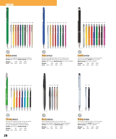 Hodox AP781190Aluminium-Kugelschreiber, blauschreibend.Gr%u00f6%u00dfe: %u00f88%u00d7129 mm Bedruckung: E0, P1(4)Menge 1+ 1 000+ 3 000+ 6 000+Preis 0,58 %u20ac 0,56 %u20ac 0,54 %u20ac 0,52 %u20acChromy AP845173Aluminium-Kugelschreiber mit gummierter Oberfl%u00e4che und Spezialbeschichtung f%u00fcr eine Spiegelgravur, blauschreibend.Gr%u00f6%u00dfe: %u00f89%u00d7140 mm Bedruckung: E1Menge 1+ 750+ 1 500+ 3 000+Preis 0,93 %u20ac 0,90 %u20ac 0,87 %u20ac 0,84 %u20acTodox AP741524Aluminium-Kugelschreiber mit Touchpen und farblich abgestimmten Stylus, blauschreibend.Gr%u00f6%u00dfe: %u00f88%u00d7136 mm Bedruckung: E0, P1(4), UVB(FC)Menge 1+ 1 000+ 3 000+ 6 000+Preis 0,40 %u20ac 0,39 %u20ac 0,38 %u20ac 0,37 %u20acRosey AP810435Metall-Kugelschreiber mit Touchpen und gl%u00e4nzender Metallic-Oberfl%u00e4che, blauschreibend.Gr%u00f6%u00dfe: %u00f810%u00d7135 mm Bedruckung: E1, P1(4)Menge 1+ 250+ 500+ 1 000+Preis 2,72 %u20ac 2,62 %u20ac 2,53 %u20ac 2,44 %u20acGambit AP791581Aluminium-Kugelschreiber mit Touchpen, blauschreibend. Gr%u00f6%u00dfe: %u00f89%u00d7125 mmBedruckung: E0, P1(4), UVB(FC)Menge 1+ 1 000+ 3 000+ 6 000+Preis 0,62 %u20ac 0,60 %u20ac 0,58 %u20ac 0,56 %u20acBishop AP741004Aluminium-Kugelschreiber mit Touchpen, blauschreibend. Gr%u00f6%u00dfe: %u00f89%u00d7140 mmBedruckung: E1, P1(4), UVB(FC)Menge 1+ 750+ 1 500+ 3 000+Preis 1,04 %u20ac 1,00 %u20ac 0,97 %u20ac 0,94 %u20ac-01-01 -02 -03 -05 -06 -06V -07 -10 -10 -21 -97 -98 -01 -10-02 -03 -05 -06 -07 -10 -21 -25 -98 -01 -02 -03 -05 -06 -07 -10 -25 -01 -02 -03 -05 -06 -07 -08 -10 -25278 WRITING