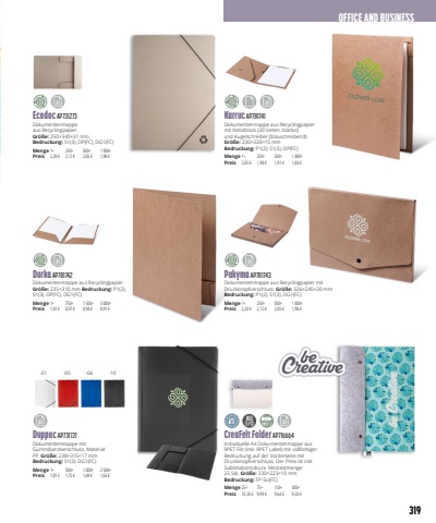 Ecodoc AP731273Dokumentenmappe aus Recyclingpapier.Gr%u00f6%u00dfe: 250%u00d7340%u00d731 mmBedruckung: S1(3), OP(FC), DG1(FC)Menge 1+ 250+ 500+ 1 000+Preis 2,20 %u20ac 2,12 %u20ac 2,05 %u20ac 1,98 %u20acDorka AP781742Dokumentenmappe aus Recyclingpapier.Gr%u00f6%u00dfe: 235%u00d7310 mm Bedruckung: P1(2), S1(3), OP(FC), DG1(FC)Menge 1+ 750+ 1 500+ 3 000+Preis 1,01 %u20ac 0,97 %u20ac 0,94 %u20ac 0,91 %u20acDuppoc AP731721Dokumentenmappe mit Gummibandverschluss. Material: PP. Gr%u00f6%u00dfe: 238%u00d7315%u00d717 mmBedruckung: S1(3), DG1(FC)Menge 1+ 500+ 1 000+ 2 500+Preis 1,81 %u20ac 1,75 %u20ac 1,69 %u20ac 1,63 %u20acKarruc AP781741Dokumentenmappe aus Recyclingpapier mit Notizblock (20 Seiten, blanko) und Kugelschreiber (blauschreibend).Gr%u00f6%u00dfe: 230%u00d7320%u00d715 mmBedruckung: P1(2), S1(3), OP(FC)Menge 1+ 250+ 500+ 1 000+Preis 2,05 %u20ac 1,98 %u20ac 1,91 %u20ac 1,84 %u20acPakyma AP781743Dokumentenmappe aus Recyclingpapier mit Druckknopfverschluss. Gr%u00f6%u00dfe: 326%u00d7245%u00d720 mmBedruckung: P1(2), S1(3), DG1(FC)Menge 1+ 250+ 500+ 1 000+Preis 2,20 %u20ac 2,12 %u20ac 2,05 %u20ac 1,98 %u20acCreaFelt Folder AP716664Individuelle A4 Dokumentenmappe aus RPET Filz (inkl. RPET Label) mit vollfarbiger Bedruckung auf der Vorderseite mit Druckknopfverschluss. Der Preis ist inkl. Sublimationsdruck. Mindestmenge: 25 Stk. Gr%u00f6%u00dfe: 330%u00d7223%u00d710 mmBedruckung: FP-SU(FC)Menge 25+ 75+ 150+ 300+Preis 10,35 %u20ac 9,99 %u20ac 9,64 %u20ac 9,30 %u20ac-01 -05 -06 -10319OFFICE AND BUSINESS