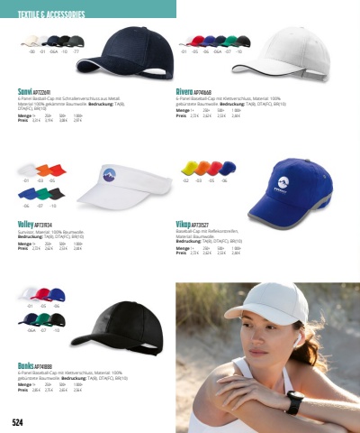 Sanvi AP7226916 Panel Basball-Cap mit Schnallenverschluss aus Metall. Material 100% gek%u00e4mmte Baumwolle. Bedruckung: TA(8), DTA(FC), BR(10)Menge 1+ 250+ 500+ 1 000+Preis 3,31 %u20ac 3,19 %u20ac 3,08 %u20ac 2,97 %u20acVolley AP731934Sunvisor, Maerial: 100% Baumwolle.Bedruckung: TA(8), DTA(FC), BR(10)Menge 1+ 250+ 500+ 1 000+Preis 2,72 %u20ac 2,62 %u20ac 2,53 %u20ac 2,44 %u20acRivera AP7416686-Panel Baseball-Cap mit Klettverschluss, Material: 100% geb%u00fcrstete Baumwolle. Bedruckung: TA(8), DTA(FC), BR(10)Menge 1+ 250+ 500+ 1 000+Preis 2,72 %u20ac 2,62 %u20ac 2,53 %u20ac 2,44 %u20ac-01-00 -06A -10 -77 -05-01 -06 -06A -07 -10-01 -03 -05-06 -07 -10Banks AP7418886-Panel Baseball-Cap mit Klettverschluss, Material: 100% geb%u00fcrstete Baumwolle. Bedruckung: TA(8), DTA(FC), BR(10)Menge 1+ 250+ 500+ 1 000+Preis 2,85 %u20ac 2,75 %u20ac 2,65 %u20ac 2,56 %u20ac-05-07-06-10-01-06AVikap AP731527Baseball-Cap mit Reflekorstreifen, Material: Baumwolle.Bedruckung: TA(8), DTA(FC), BR(10)Menge 1+ 250+ 500+ 1 000+Preis 2,72 %u20ac 2,62 %u20ac 2,53 %u20ac 2,44 %u20ac-02 -03 -05 -06524 TEXTILE & ACCESSORIES