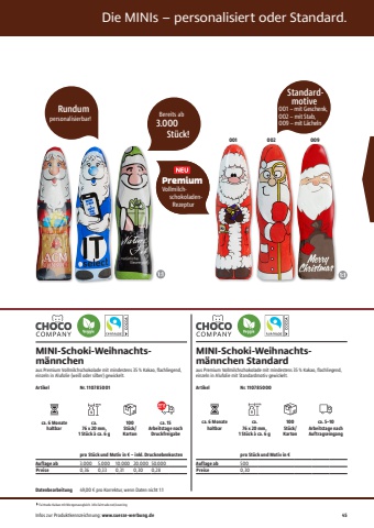 45001 002 009Infos zur Produktkennzeichnung: www.suesse-werbung.depro St%u00fcck und Motiv in %u20ac %u2013 inkl. DrucknebenkostenAuflage ab 3.000 5.000 10.000 20.000 50.000Preise 0,36 0,33 0,31 0,30 0,28Datenbearbeitung 49,00 %u20ac pro Korrektur, wenn Daten nicht 1:1pro St%u00fcck und Motiv in %u20acAuflage ab 500Preise 0,30Die MINIs %u2013 personalisiert oder Standard.MINI-Schoki-Weihnachtsm%u00e4nnchenaus Premium Vollmilchschokolade mit mindestens 35 % Kakao, flachliegend, einzeln in Alufolie (wei%u00df oder silber) gewickelt.Artikel Nr. 110785001ca. 6 Monatehaltbarca. 76 x 20 mm, 1 St%u00fcck %u00e0 ca. 6 g100 St%u00fcck/Kartonca. 15 Arbeitstage nach DruckfreigabeMINI-Schoki-Weihnachtsm%u00e4nnchen Standardaus Premium Vollmilchschokolade mit mindestens 35 % Kakao, flachliegend, einzeln in Alufolie mit Standardmotiv gewickelt.Artikel Nr. 110785000ca. 6 Monatehaltbarca. 76 x 20 mm, 1 St%u00fcck %u00e0 ca. 6 g100 St%u00fcck/Kartonca. 5%u201310 Arbeitstage nach Auftragseingang Fairtrade-Kakao mit Mengenausgleich. info.fairtrade.net/sourcing Bereits ab 3.000 St%u00fcck! Rundumpersonalisierbar! Standard- motive001 %u2013 mit Geschenk, 002 %u2013 mit Stab, 009 %u2013 mit L%u00e4chelnPremiumVollmilch- schokoladen- Rezeptur