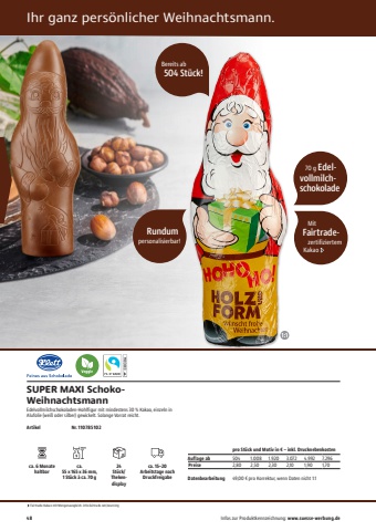 48 Infos zur Produktkennzeichnung: www.suesse-werbung.depro St%u00fcck und Motiv in %u20ac %u2013 inkl. DrucknebenkostenAuflage ab 504 1.008 1.920 3.072 4.992 7.296Preise 2,80 2,50 2,30 2,10 1,90 1,70Datenbearbeitung 49,00 %u20ac pro Korrektur, wenn Daten nicht 1:1 Fairtrade-Kakao mit Mengenausgleich. info.fairtrade.net/sourcingIhr ganz pers%u00f6nlicher Weihnachtsmann.SUPER MAXI SchokoWeihnachtsmannEdelvollmilchschokoladen-Hohlfigur mit mindestens 30 % Kakao, einzeln in Alufolie (wei%u00df oder silber) gewickelt. Solange Vorrat reicht.Artikel Nr. 110785102ca. 6 Monatehaltbarca. 55 x 165 x 36 mm, 1 St%u00fcck %u00e0 ca. 70 g24 St%u00fcck/Thekendisplayca. 15%u201320 Arbeitstage nach Druckfreigabe Mit Fairtrade- zertifiziertem Kakao Rundumpersonalisierbar! 70 g Edelvollmilchschokolade Bereits ab 504 St%u00fcck!