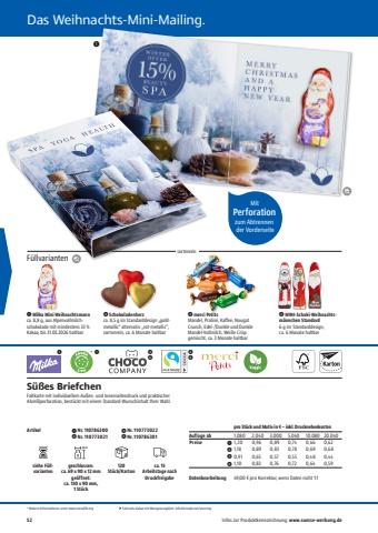 52*uvxvxu uInfos zur Produktkennzeichnung: www.suesse-werbung.depro St%u00fcck und Motiv in %u20ac %u2013 inkl. DrucknebenkostenAuflage ab 1.080 2.040 3.000 5.040 10.080 20.040Preise u 1,20 0,96 0,89 0,74 0,66 0,62v 1,18 0,89 0,83 0,78 0,69 0,68w 0,91 0,65 0,57 0,55 0,48 0,44x 1,10 0,83 0,76 0,72 0,64 0,59Datenbearbeitung 49,00 %u20ac pro Korrektur, wenn Daten nicht 1:1u Milka Mini Weihnachtsmannca. 8,8 g, aus Alpenvollmilchschokolade mit mindestens 33 % Kakao, bis 31.03.2026 haltbarF%u00fcllvarianten Das Weihnachts-Mini-Mailing.S%u00fc%u00dfes BriefchenFaltkarte mit individuellem Au%u00dfen- und Innenseitendruck und praktischer Abrei%u00dfperforation, best%u00fcckt mit einem Standard-Wunschinhalt Ihrer Wahl.Artikel u Nr. 110786300 w Nr. 110773022v Nr. 110773021 y Nr. 110786301siehe F%u00fcllvariantengeschlossen: ca. 69 x 90 x 12 mmge%u00f6ffnet: ca. 150 x 90 mm, 1 St%u00fcck120 St%u00fcck/Kartonca. 15 Arbeitstage nach Druckfreigabe* Weitere Informationen unter www.cocoalife.orgsortenrein Mit Perforation zum Abtrennen der Vorderseitex MINI-Schoki-Weihnachtsm%u00e4nnchen Standard6 g im Standarddesign, ca. 6 Monate haltbarv Schokoladenherz ca. 8,5 g im Standarddesign %u201egoldmetallic%u201c alternativ %u201erot-metallic%u201c, sortenrein, ca. 6 Monate haltbarw merci PetitsMandel, Pralin%u00e9, Kaffee, Nougat Crunch, Edel-/Dunkle und Dunkle Mandel-Vollmilch, Wei%u00dfe Crisp gemischt, ca. 3 Monate haltbar Fairtrade-Kakao mit Mengenausgleich. info.fairtrade.net/sourcing